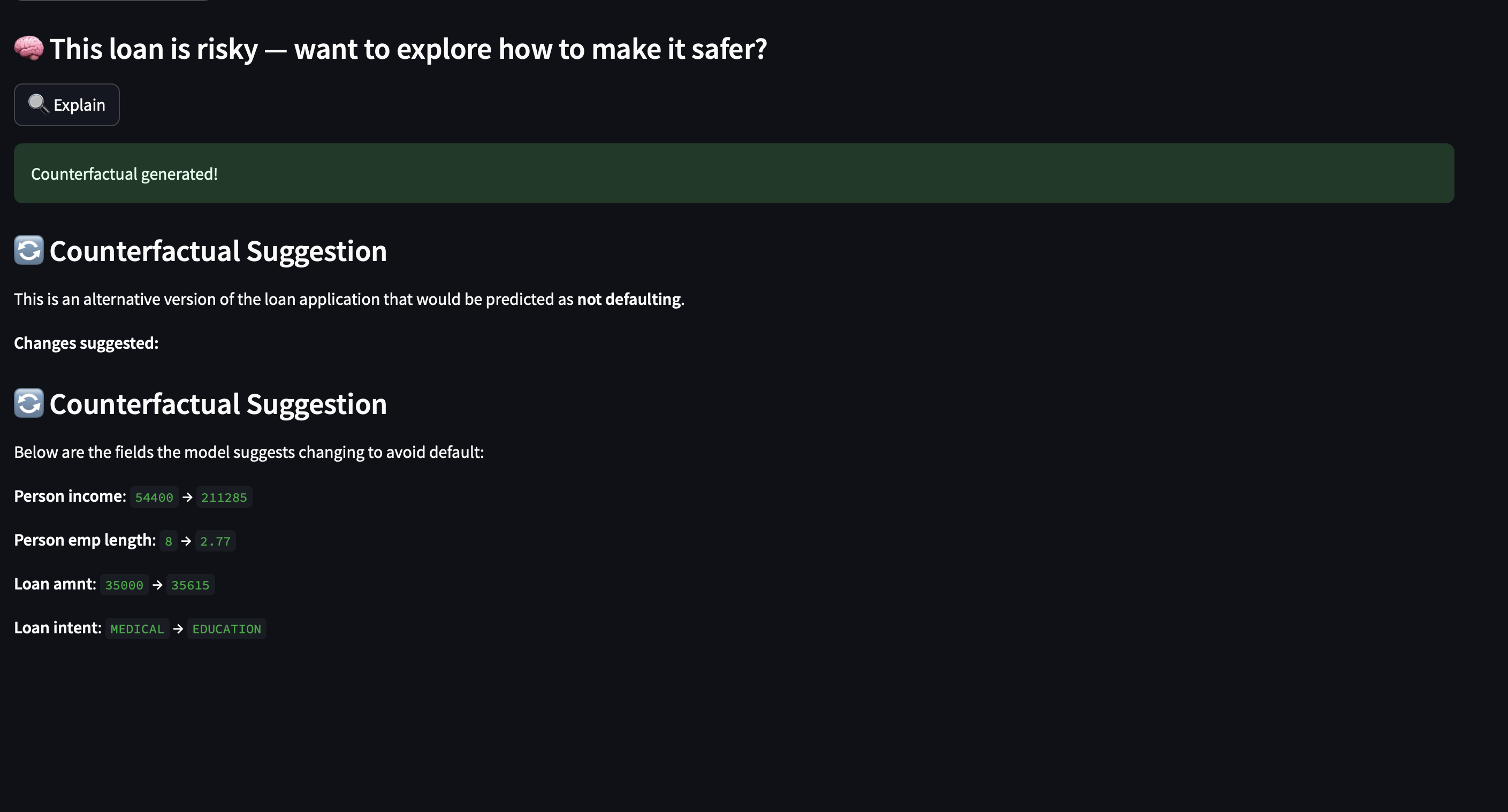 For a loan applicant predicted to default, the method produced a counterfactual flipping the label to non-default by nudging: